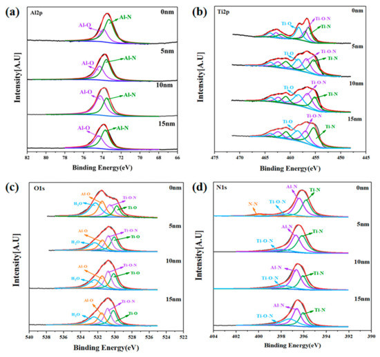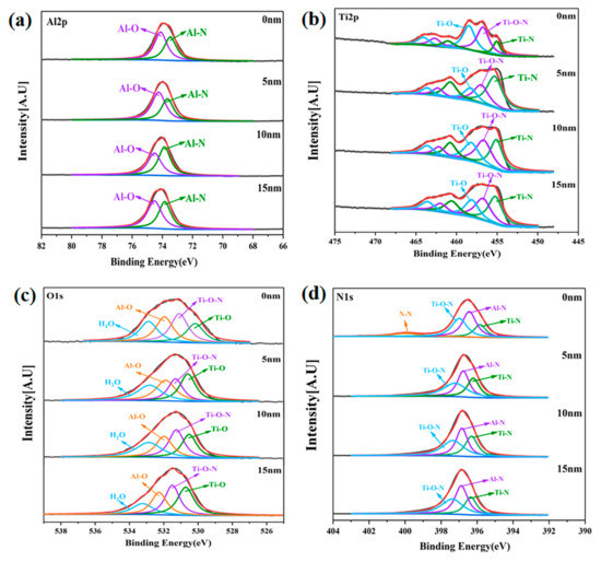 Sets of core level spectra as a function of sputtering depth (d = 0, 5, 10, and 15 nm) acquired from the LPCVD-Ti0.17Al0.83N and the PVD-Ti0.40Al0.60N coatings after immersion are shown in Figure 8 and Figure 9. The Al 2p, Ti 2p, and O 1s spectra at depths from 0 to 15 nm had similar appearances. The Al 2p spectra of the LPCVD-Ti0.17Al0.83N coating were composed of two peak contributions at ~73.5 eV (TiAlN) and ~74.1 eV (Al2O3) [44], as illustrated in Figure 8a. The Ti 2p spectra could be deconvoluted into several peaks, as indicated in Figure 8b. Amongst them, the spin-orbit of Ti 2p3/2 consisted of three peaks at ~455, ~456.7, and ~458.5 eV, which are related to TiAlN, TiOxNy, and TiO2, respectively [45,46]. The O 1s spectra of the LPCVD-Ti0.17Al0.83N coating recorded as a function of sputter depth are displayed in Figure 8c. The O 1s signals were fitted by four peaks centered at ~529.78, ~530.58, ~531.48, and ~532.28 eV. The components centered at ~529.78, ~530.58, and ~531.48 eV were assigned to TiO2, TiOxNy, and Al2O3, respectively [47]. A peak located at ~532.28 eV may have been associated with physically adsorbed molecular H2O [48]. The N 1s spectrum recorded from d = 0 nm was distinctly different from that observed at d = 5–15 nm. Figure 8d shows an apparent increase in the contribution at ~401 eV in the N 1s signal from d = 0 nm. This high binding energy chemical state of nitrogen could be assigned to the N2 formed during the anodic oxidation of the Ti1−xAlxN coating [49].