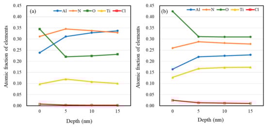 It can be seen from Figure 9 that the XPS spectra of the PVD-Ti0.40Al0.60N coating had similar characteristics to those of the LPCVD-Ti0.17Al0.83N coating. For both samples, metallic oxides were generated, leading to the formation of a composite Al2O3/TiO2 passive layer, improving the corrosion resistance of the coatings. A significant increase in the contribution at 74.1 eV corresponding to the Al–O bonds was shown in the Al 2p spectrum of the LPCVD-Ti0.17Al0.83N coating, as indicated in Figure 8a. This implied that higher Al content favors the formation of alumina, which can improve the protective effect of the coating. Furthermore, different distributions of elements along depth could be observed for the LPCVD-Ti0.17Al0.83N and PVD-Ti0.40Al0.60N samples. According to the XPS quantitative chemical analysis, as shown in Figure 10, the O and Cl concentrations were clearly lower in the LPCVD-Ti0.17Al0.83N coating than in the PVD-Ti0.40Al0.60N coating. The XPS analysis confirmed the EIS results (as described in Section 3.2) that the more uniform and denser passive layer formed on the LPCVD-Ti0.17Al0.83N coating suppressed diffusion of O and Cl, thus promoting the protective effect.