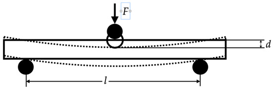Three-point bending test; bar sample and three rollers are visible; (F) load; (l) roller span; (d) deflection (corresponding to load F).
