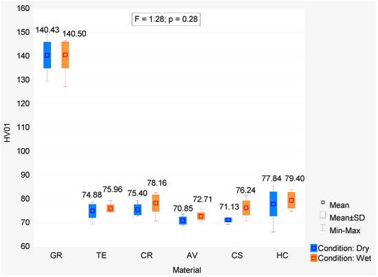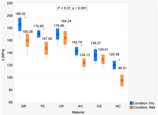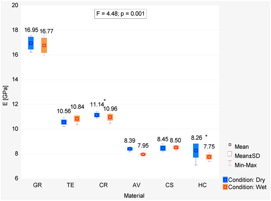 The flexural modulus values ranged from 7.75 (SD 0.19) GPa for HC Wet to 16.95 (SD 0.50) GPa for GR. The recorded GR flexural modulus (Dry and Wet) was significantly higher in comparison to the other tested materials and was also higher for TE (Dry and Wet) and CR (Dry and Wet) compared to AV (Dry and Wet), CS (Dry and Wet), and HC (Dry and Wet). The values of the flexural modulus changed in the descending order as follows: GR Dry > GR Wet > CR Dry > CR Wet > TE Wet > TE Dry > CS Wet > CS Dry > AV Dry > HC Dry > AV Wet > HC Wet.