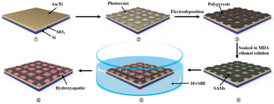 The growth and remodeling of bone tissue are accompanied by the generation of endogenous electrical signals [1,2,3,4]; therefore, the electrical environment is one of the important microenvironments for bone cells. In fact, external electrical stimulation (ES) has been used in the clinical treatment of bone diseases, such as fractures and osteoporosis [5,6,7]. Till now, many studies have also confirmed that ES can promote the proliferation and differentiation of osteoblasts [8], so as to promote the formation and regeneration of new bone [9,10]. In addition, the chemical composition and topological morphology of the material surface in contact with cells, and the application of external stimulation signals (electricity, light, magnetism, etc.), have significant impact on the metabolism of cells [11,12]. Therefore, appropriate morphological design, chemical component improvement and external applied stimulation can have important effects on the adhesion, spreading, proliferation and differentiation of cells [13,14,15]. With the help of some high-precision processing methods, it is possible to design and construct composite structures with different physical and chemical properties and topological morphologies. The micro electro mechanical system (MEMS) integrates many high-precision machining methods, such as lithography, corrosion and so on [16]. At present, it is widely used to manufacture advanced micro-integrated intelligent packing devices. Application of lithography technology can help to fabricate some patterned structures with micro- or nano-scale graphics. The self-assembled monolayer (SAM) technique could achieve functional modification of materials by adjusting the end groups at both ends of long-chain organic molecules [17].