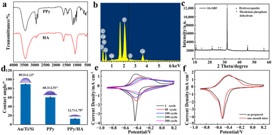 (a) FITR spectra of micropatterned PPy and HA in micropatterned PPy/HA composite coatings; (b) EDS spectrum of micropatterned PPy/HA composite coatings; (c) XRD spectrum of micropatterned PPy/HA composite coatings; (d) The water contact angle of different material substrates; (e) Cyclic voltammogramms of micropatterned PPy in 0.9% NaCl solution with different cycle turns at the scan rate of 50 mV/s; (f) Long-term electroactive stability of micropatterned PPy at the scan rate of 50 mV/s.