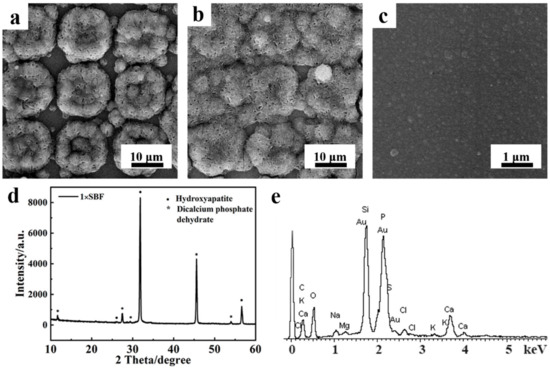 Immersing micropatterned PPy/HA composite coatings in SBF (×1) with standard concentration, it was found that the HA part acted as nucleation sites to promote further mineralized deposition of HA. From the SEM images, it could be seen that newly formed HA covered the original HA region and continued to epitaxially grow after soaking in 1× SBF for only 2 d. Till the 4th d, HA almost enclosed the whole substrate and formed a new layer of HA (Figure 4a,b). However, no HA crystals were observed on pure PPy coatings under the same conditions (Figure 4c). These results indicated that the PPy/HA composite coatings had excellent biological activity and could quickly induce the mineral deposition of HA.