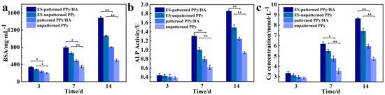 When osteoblasts adhere to the surface of the material and proliferate rapidly, they initiate the synthesis of related proteins [51]. Therefore, the assay of the total cellular protein content could reflect the cell survival and proliferation. Based on the total protein content of MC3T3-E1 cells grown on different materials (Figure 6a), it could be seen that the total protein content increased with time in all groups, indicating that all groups of materials could promote the secretion and synthesis of proteins. Protein synthesis in cells with high proliferative activity was more abundant and metabolically vigorous, which could disperse, spread and multiply on the material surface in a short period of time. The protein content of cells on the micropatterned PPy/HA composite coatings was higher than that on the un-patterned PPy, which indicated that the modification of HA and micropatterning can promote cell adhesion, spreading and proliferation, thus, further promoting the increase of total cellular protein content. The cellular protein content on all materials of the ES groups was significantly higher than that of the non-ES groups, and the discrepancy was greatest at 14 d. This indicated that the cellular growth state was exuberant with ES, resulting in a significant increase in cellular protein synthesis. The highest protein content was found in the group wherein cells grew on micropatterned PPy/HA composite coatings with ES, demonstrating that MC3T3-E1 cells under this culture condition had more vigorous metabolic and proliferative activities.