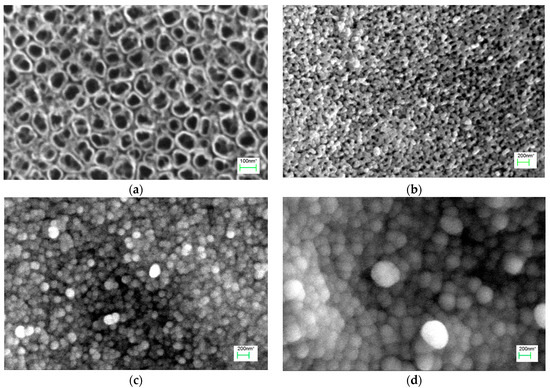 The self-ordered TiO2ntbs (Figure 1a) were obtained using the anodic oxidation of the Ti surface in an aqueous H2SO4 solution containing some NH4F. The average tube diameter was about 100 nm and the thickness of the titania layers was ~350 nm. The Ni adlayers of different thicknesses were deposited on the TiO2ntb surface. The typical images are presented in Figure 1b–d, from which it is evident that just after 5 s of deposition, the TiO2ntb surface is not completely covered by Ni layers, while just after 20 s and 60 s of deposition, the TiO2ntb surface is covered by Ni layers. As also seen from Figure 1c,d, the granular morphology is characteristic of a number of deposits.