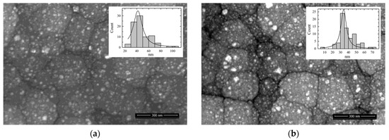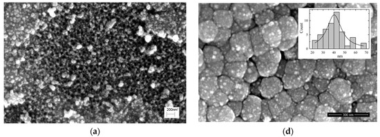 As evident from the SEM images presented in Figure 2, the dipping of Ni-TiO2ntb electrodes into the Au-containing solution results in the deposition of numerous Au crystallites on the Ni surface, while the size and distribution of Au crystallites depends on the thickness of the deposited Ni sublayer on the TiO2ntb and the dipping time in the Au-containing solution. After immersion of the TiO2ntb surface completely covered by the Ni layer in the Au-containing solution for 10–60 s and 10–300 s, the Au crystallites with the average size of ca. 40 and 50 nm, respectively, were deposited onto the latter surface (the insets in Figure 2d–f and Figure 3). They were quite uniform in size and well-separated. While the separate islands of larger Au crystallites were deposited after immersion of the TiO2ntb surface partly covered by the Ni layer (Figure 1b) in the Au plating solution for 60, 300, and 1800 s, respectively (Figure 2a–c).