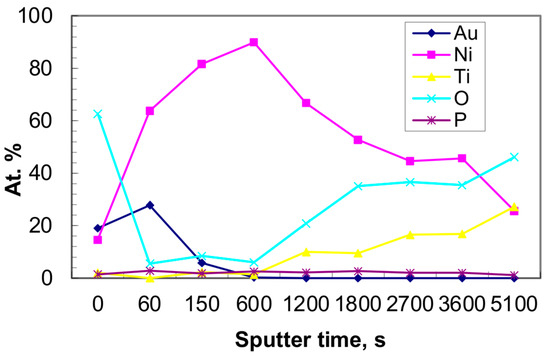 For the determination of the elemental composition of coatings, the Au4f7/2, Ni2p3/2, Ti2p3/2, P2p, and O1s spectra were recorded. The empirical elemental sensitivity factors were taken from [67], and the spectra obtained were compared with the standard ones [68].