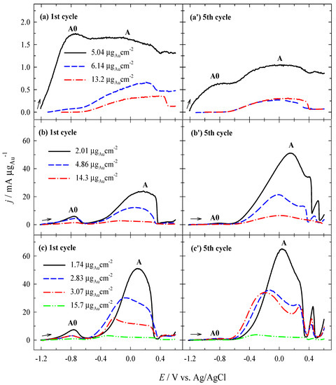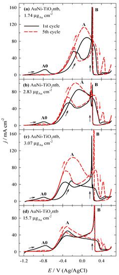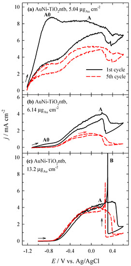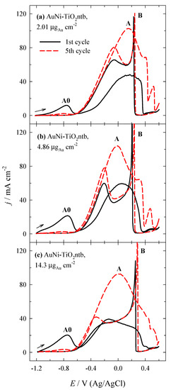 The catalytic activity of the AuNi-TiO2ntb catalysts fabricated under different conditions was studied towards the BH4− ion oxidation in the alkaline media by CV (Figure 5, Figure 6 and Figure 7). All the catalysts show the electrocatalytic activity towards the oxidation of BH4− ions. Obviously, two peaks: peak A0 at more negative potential values and another peak A at more positive potential values, are seen in the tested potential window on all the catalysts. Those peaks correspond to the oxidation of H2, generated from NaBH4 hydrolysis and direct BH4− ion oxidation, as described in the literature [9,17,19]. Figure 5 shows the CVs for the AuNi-TiO2ntb catalysts prepared with a thinner Ni layer and the Au loading of 5.04 (Figure 5a), 6.14 (Figure 5b), and 13.2 (Figure 5c) μgAu·cm−2. The current densities for BH4− ions on those catalysts decreased with long-term cycling, whereas, in contrast, the current densities increased on the catalysts with the thicker Ni layers (Figure 6 and Figure 7). The catalysts created on the thicker Ni layer of about 100 and 400 nm deposited onto the TiO2ntb surface, with the Au loadings in the range of 1.74 to 15.7 μgAu·cm−2 (Figure 6 and Figure 7) showing current densities for BH4− ion oxidation about 10–20 times higher compared to the catalysts prepared with the thinner Ni layer, indicating the increased activity and stability of catalysts (Figure 6 and Figure 7). Notably, the electrocatalytic activity improved remarkably as the thicker Ni layer was used for the deposition of Au crystallites. The enhanced activity of those catalysts may be related with the synergistic effect of Au crystallites with Ni [69]. Atomic ratios Au:Ni varied from 1:28 to 1:350 and from 1:33 to 1:618 for AuNi-TiO2ntb catalysts with the Au loadings in the range of 2.01 to 14.30 μgAu·cm−2 and 1.74 to 15.7 μgAu·cm−2, respectively (Table 2). A very small amount of Au crystallites associated to Ni induces increased BH4− ion oxidation.