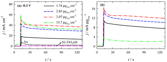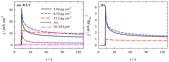 The stability of prepared catalysts was observed from chronoamperometric measurements and compared to bulk Au and Ni-TiO2ntb (Figure 9, Figure 10 and Figure 11). The AuNi-TiO2ntb catalysts in all cases show a slight current decay for BH4− ion oxidation. At the end of the experimental period (t = 130 s), the current densities of all the AuNi-TiO2ntb catalysts are higher than that of Au and Ni-TiO2ntb, indicating their superior stability and significantly higher catalytic activity for BH4− ion oxidation.