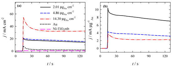 The activity of the prepared catalysts for BH4− ion oxidation was also determined in terms of the mass of deposited Au. Considering the mass activity of the catalysts, the normalized current density values by the Au loadings for each catalyst are shown in Figure 8.