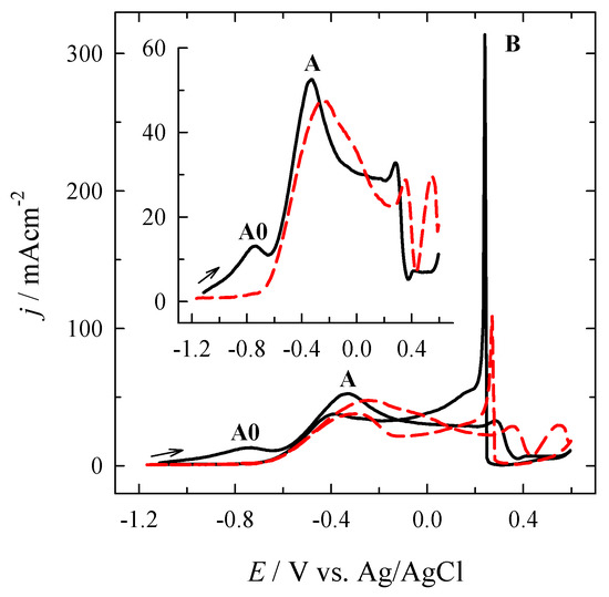 The electrocatalytic stability of the AuNi-TiO2ntb catalyst was examined herein by numerous cycling in a 0.05 M NaBH4 + 1.0 M NaOH solution between −1.1 and 0.6 V at 10 mV·s−1. Figure 12 shows CVs after long-term potential cycling (after 6 h) for the AuNi-TiO2ntb catalyst that has the Au loading of 15.7 μgAu·cm−2. After the six-hour continuous cycling, the value of anodic peak A related to BH4− ion oxidation was slightly lowered and slightly shifted toward positive values. Thus, long cycling results in the disappearance of the first anodic peak A0. Hence, it may be suggested that the fabricated electrode is electrocatalytically active and stable after long-term cycling.
