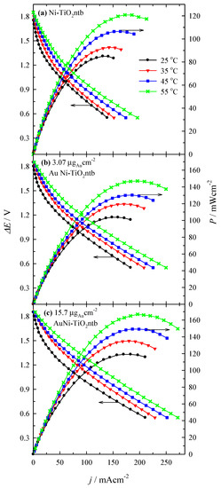 Direct alkaline NaBH4-H2O2 single fuel cell tests were carried out by employing the prepared Ni/TiO2ntb and AuNi-TiO2ntb catalysts, which have the Au loadings of 3.07 and 15.7 μgAu·cm−2 as the anode catalyst at temperatures from 25 to 55 °C. Figure 13 shows the obtained fuel cell polarization curves and the corresponding power densities against the current density.
