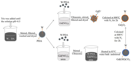 Weigh 1.25 g of Gd(NO3)3·6H2O in a beaker, add 40 mL of deionized water, and stir with a glass rod to completely dissolve it. Then, add 4.15 g of urea and 0.5 g of W/PDA powder, stir magnetically for 30 min, and then ultrasonicate for 20 min. The ultrasonic liquid was heated in a water bath at 85 °C, magnetically stirred for 3 h, washed twice with water and ethanol, and then dried in a 60 °C oven. Finally, the dried sample was calcined in a muffle furnace at 800 °C with N2 (heating rate 2 °C/min) for 2 h [22].