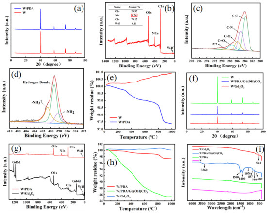 (a) XRD pattern of W and W/PDA; (b) XPS broad spectrum of W/PDA; (c) XPS peak fitting pattern of C1s of W/PDA; (d) XPS peak fitting pattern of N1s of W/PDA; (e) TG curve of W and W/PDA; (f) XRD pattern of W, W/PDA/Gd(OH)CO3 and W/Gd2O3; (g) XPS spectra of W/PDA and W/Gd2O3; (h) TG curves of W/PDA, W/PDA/Gd(OH)CO3, and W/Gd2O3; and (i) FTIR spectra of W, W/PDA, W/PDA/Gd(OH)CO3, and W/Gd2O3.