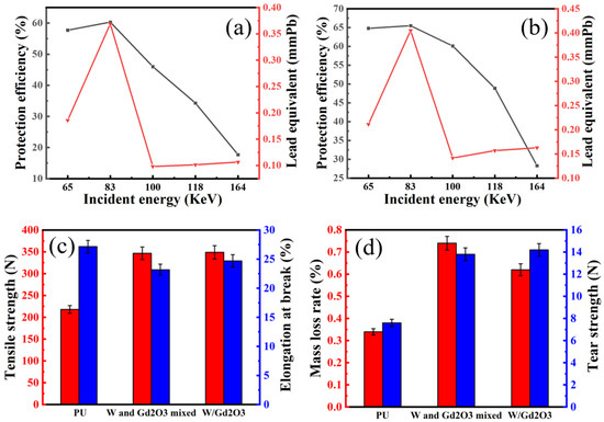 (a) Protective performance of PU coating fabric with W and Gd2O3 mixed powder; (b) protective performance of PU coating fabric with core–shell structure W/Gd2O3 powder; (c) tensile properties of pure PU coating fabric, W and Gd2O3 mixed powder PU coating fabric, and core–shell structure W/Gd2O3 powder PU coating fabric; (d) Wear resistance and tearing properties of pure PU coating fabric, W and Gd2O3 mixed powder PU coating fabric and core–shell structure W/Gd2O3 powder PU coating fabric.