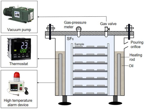 To reduce the error caused by the dispersion of samples, three samples were arranged under each ageing condition for independent repeated tests. At each temperature, the samples were put in reverse order into the closed constant temperature heating platform in SF6, which is shown in Figure 1. The samples with an ageing time of 1200 h were put in first, the samples with an ageing time of 600 h were put in after 600 h, the sample with an ageing time of 300 h was put in after 300 h, and so on. All samples were placed in the ageing chamber according to the required ageing time. The aim was to take all samples out on the same day, effectively avoiding the measurement environment’s impact. After thermal ageing, the samples should be placed in a dry airtight container for at least 24 h before performance testing.