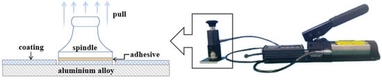 The adhesion tester and test principle as shown in Figure 2, the PosiTest AT-A coating adhesion test instrument made by Defelsko was used in the adhesion test. Spindles with a diameter of 20 mm were selected. A two-part Araldite 2015 (Huntsman Advanced Materials, Beijing, China) adhesive was used to stick the spindle to the epoxy coating’s surface. Reference standard ISO-4624-2003 paints and varnishes were used for the pull-off test for adhesion []; the pull was applied at a constant rate until the coating fell off. Average coating adhesion was obtained by testing three samples at each ageing time node.