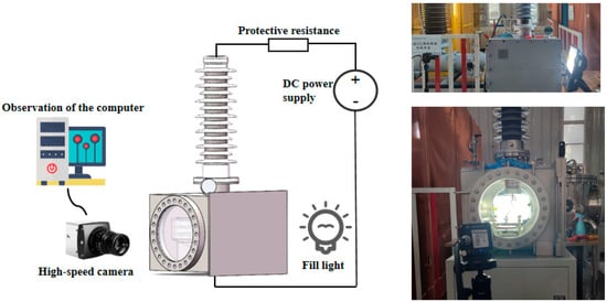 The observation platform of particle motion is shown in Figure 3. The aluminum alloy electrode was suspended with plastic bolts in the funnel-shaped cavity. The pole spacing was set to 20 mm. Then it was placed in a sealed metal cavity, vacuumized and filled with 0.1 MPa SF6 gas so that the breakdown voltage of the experiment could be greater than that of the air environment. The signal generator generated the DC voltage (Agilent 33522A, Palo Alto, CA, USA), amplified 5000 times by the high voltage amplifier (Trek Model 50/12 A, Denver, CO, USA) and applied to the electrode plate. The motion of the metal particles was observed with a high-speed camera (Fastec HiSpec5, Shanghai, China), and the high-speed camera took 1000 frames per second. At the same time, a high-power LED was used to fill the light of the test platform.