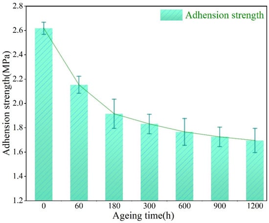The relationship of adhesion between aluminum and aged epoxy coatings is shown in Figure 4. It can be seen from the figure that the adhesion between the unaged epoxy resin coating and aluminum alloy is 2.628 MPa. After 1200 h of ageing at SF6 at 160 °C, the adhesion decreased to 1.695 MPa, falling by 35.50%. The adhesion is 1.831 MPa at 300 h of ageing, decreasing by 30.32%. The results showed that the decrease in adhesion was mainly concentrated in the early stage of the ageing experiment. During the whole ageing experiment, the adhesion decreased by 0.933 MPa in total. In the first 300 h of ageing, the adhesion decreased by 0.797 MPa, accounting for 85.42% of the decrease in the whole process.