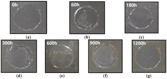 Samples after the pull-off test. (a) 0 h; (b) 60 h; (c) 180 h; (d) 300 h; (e) 600 h; (f) 900 h; (g) 1200 h.