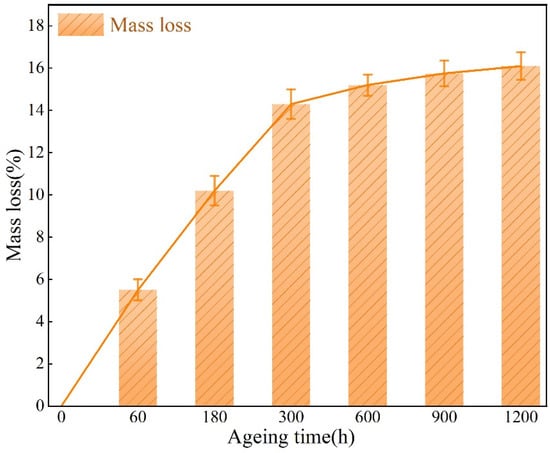 The Figure 6 shows the relationship between the mass loss rate of epoxy resin coatings and ageing time under the environment of sulfur hexafluoride at 160 °C. With an increase in ageing time, the weight loss rate of epoxy resin coating increases gradually. In the early stage of the ageing test, the coating mass loss rate is the fastest. In the first 300 h, the mass loss rate reaches 14.7%. As the ageing time increases, the mass loss rate decreases and the coating’s quality changes little. After the whole ageing experiment, the mass loss rate reached 16.2%, an increase of only 1.5% compared with the first 300 h. In the first quarter of the ageing experiment, the mass loss accounted for 90.74% of the total mass loss. In the last three quarters of the experiment, the loss rate of quality accounted for only 9.26% of the whole experiment.