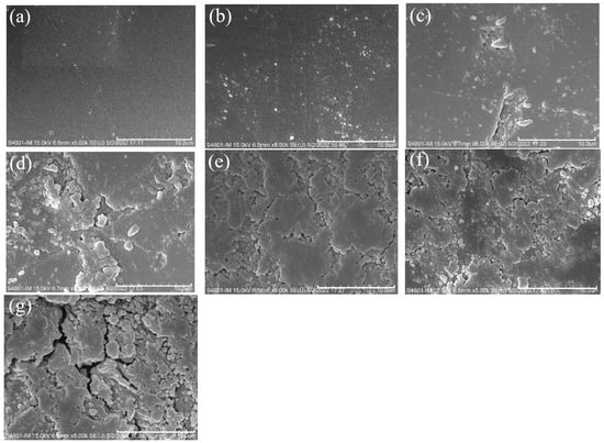 The SEM images of samples in different ageing stages at 5000 times magnification. (a) 0 h; (b) 60 h; (c) 180 h; (d) 300 h; (e) 600 h; (f) 900 h; (g) 1200 h.