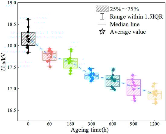 The lifting voltage of particles with different ageing times was tested. The results show that the lifting voltage was 12.42 kV when the test was carried out on the bare electrode. To ensure the reliability of the experimental results, multiple groups of experiments were carried out on samples with different ageing degrees. The experimental results are shown in Figure 10. When the surface of the electrode was coated with epoxy resin, the lifting voltage increased to 18.12 kV, which is about 45.89% higher than that of the bare electrode. With the increase in ageing time, the inhibitory effect of the coating on particles decreased gradually. When the ageing time reached 1200 h, the particle-lifting voltage was about 16.86 kv. Although the lifting voltage decreased, it was still significantly higher than that of the bare electrode, which was about 35.7%, indicating that the ageing coating still had an obvious inhibitory effect on the movement of particles.