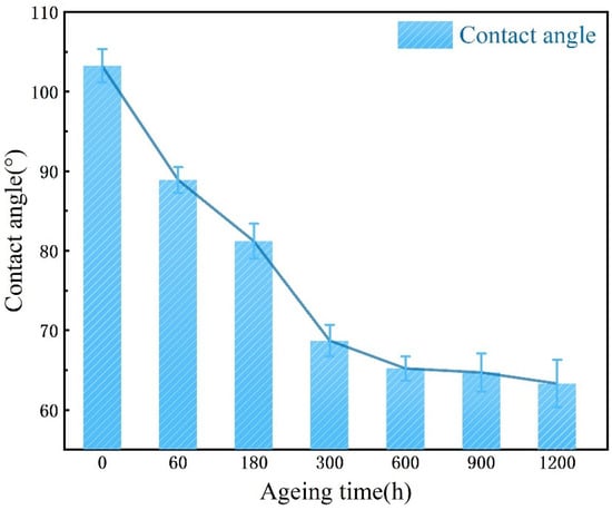 Figure 11 shows the relationship between contact angle and ageing time of epoxy resin coating. The contact angle tested for aluminum is 62.4°. The test results of the contact angle of epoxy resin coating are shown in Figure 8. The contact angle decreases from 103° to 68.7°. The polarity of the aged epoxy resin coating is better matched with that of aluminum, indicating that the adhesion between the aged coating and aluminum alloy is stronger. The increase in adhesion work will make it more difficult for particles to move.