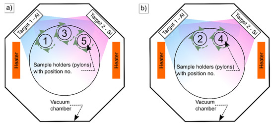 Two coating runs with different setups of pylons were carried out (Figure 1). Different positions in the overlapping Al and Si plasmas allowed different chemical compositions. The samples at the positions 2, 4 and 5 were fixed at different heights, which allowed shadowing of one of the plasmas partially. Closer distances of the sample to a target increased the concentration of the corresponding element in the final coating. At position 3, the geometric distances from the sample to the Al and the Si targets were identical.