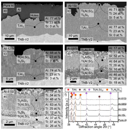 The respective microstructures of the deposited coatings of pure Al, Al-1Si, Al-12Si, Al-58Si and Al-81Si (at.%) on the γ-TiAl-based alloy TNB-V2 are shown in the SEM cross sections in Figure 2a–e. Additionally, the corresponding XRD results are displayed in Figure 2f. These coating compositions were chosen because they cover the whole range of different morphologies received after deposition by DC magnetron sputtering. The coating morphologies of the Al-2Si and Al-3Si coatings are comparable to the Al-1Si coating, whereas the Al-64Si coating is comparable to the Al-58Si, and the Al-78Si is similar to the Al-81Si coating (at.%).