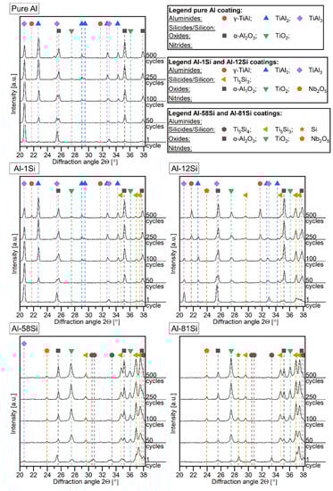 In the Al-1Si coating, the TiAl3 and TiAl2 phases already transformed into γ-TiAl after 2000 cycles. The Ti5Si3 phase degraded with increasing time. However, due to the low intensity of peaks after 1000 cycles, the precise point in time cannot be identified. No changes in the oxide peaks’ intensity are visible, and the α-Al2O3 oxide is still the main present oxide.