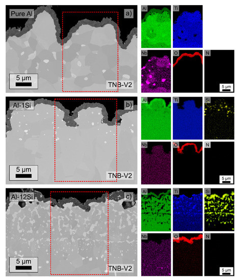 The structure of the Al-81Si coating is similar to the Al-58Si coating with its three regions. However, the top layer of the Ti7Al5Si12 phase is extended, whereas the interlayer of Ti(Al,Si)3 has a smaller size and significantly more bright grains of Ti5Si3 phase. The striped structure adjacent to the substrate also exists in the Al-81Si coating (Figure 3e).