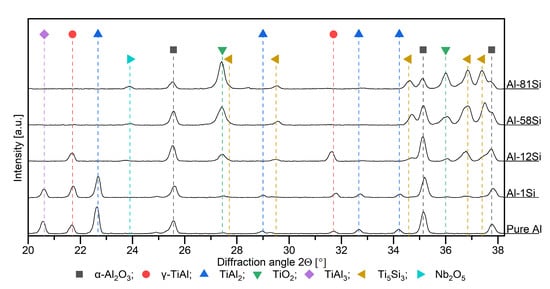 The Al-12Si coating shows mainly increasing TiO2 peak intensities. However, the Al2O3 and TiAl signals decrease only slightly. TiN could also be present, however, due to the proximity of the TiN peak to the peak of the Ti5Si3 phase; this phase is difficult to identify unambiguously. The peaks of the Ti5Si3 phase do not change and Nb2O5 is present in traces.