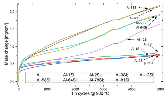 In order to obtain a better understanding of the sustainable lifetime and further oxidation processes, cyclic oxidation tests were continued up to 5000 cycles at 900 °C (Figure 10). After 1500 cycles, the Al-12Si coating has an increasing mass gain and the curve deviated from a parabolic course and represented a rather increasing progression. The same behavior is shown by the curves for the Al-58Si and Al-64Si coatings.