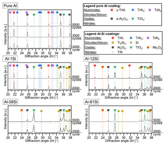 The Al-81Si coating shows a behavior similar to the Al-58Si coating. The main phases are TiO2 and Al2O3, which were already present after 500 cycles (compare to Figure 5). Nb2O5 is still detected after 5000 cycles, but the intensity of its peaks decreases over time. Si disappears after 3000 cycles, and the intensity of the Ti5Si3 peaks decreases due to the growth of the overlying TiO2 phase.