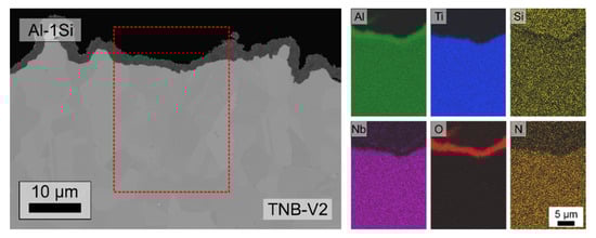 In this work, internal oxides were found within the whole Ti5Si3 layer of the Al-81Si coating, while in the case of the Al-58Si coating the oxides were present only in the region above the former Ti(Al,Si)3 interlayer (compare to Figure 3, Figure 8 and Figure 14). This indicates that the Al-rich Ti(Al,Si)3 phase further suppresses the inward diffusion of oxygen by reacting with it and forming Al2O3. However, in the case of the Al-81Si coating, the first Al-rich phase is the γ-TiAl phase in the substrate.