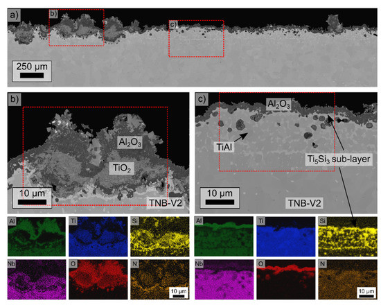 The cross section of the Al-12Si coating after 5000 cycles of oxidation reveals the formation of oxide nodules in some regions of the coating, whereas other regions are still undamaged (Figure 13). The nodules consist of different oxides. The former Al2O3 layer is still present. However, above are larger grains of TiO2 and below fine crystalline TiO2. Additionally, Nb and Si are present in the TiO2. The XRD results in Figure 11 indicate that Nb is present as Nb2O5, whereas Si can be present in a solid solution or amorphous SiO2. A nitride layer, presumably TiN, is detected beside a silicide layer below the oxide nodule. The undamaged regions of the Al-12Si coating show minor changes after the 5000 cycles (compare to Figure 7). The main phase in the TGO is still Al2O3 with traces of Ti. The thickness of the oxide layer is around 2.2 µm in the undamaged region. Below the TGO, a Ti5Si3 sub-layer formed, which is interrupted only sporadically (Figure 13c). Inside the coating, larger grains of Ti5Si3 within a γ-TiAl matrix are present. Additionally, internal oxides are visible, which are rich in Si. These internal oxides are adjacent to Ti5Si3 phases. Thus, it could be assumed that these oxides are amorphous SiO2. Some regions below the TGO are marked by a higher Ti content.