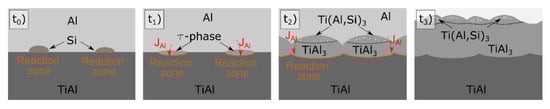 The Al-1Si coating still contains pure Al after the heat treatment as well, according to XRD (Figure 3f). However, in the observed coating regions in SEM, no pure Al top layer is visible (Figure 3b). The cross section reveals two regions of the reaction zone: on top, a Si-containing region with columnar grains of the Ti(Al,Si)3 phase formed with an average Si content of 5 at.%. The peak shift of the TiAl3 phase in XRD can be a result of the smaller radius of Si atoms in comparison to the substituted Al. Below the Si-containing region, no Si is found and globular grains of pure TiAl3 phase are present.