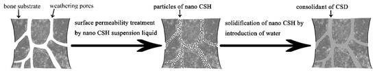 Hence, in this paper, a suspension of nano calcium sulfate hemihydrate in an alcohol solvent was prepared and explored as a novel consolidating agent for oracle bones under an indoor environment. The suspension liquid was introduced into the bone samples by surface permeability and then hydrated into an adhesive calcium sulfate dihydrate, which is illustrated in Figure 1. Due to the formation of the calcium sulfate dihydrate, the pores and cracks in the weathering bone samples were filled and the integrity of the samples was reestablished. The consolidation effect was evaluated by scanning electron microscopy (SEM), energy-dispersive X-ray spectroscopy (EDX), X-ray diffractometry (XRD), hardness, porosity, and color difference determination.