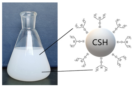 The suspension stability of CSH in 2-propanol was evaluated by absorbance measurements and the results are shown in Table 1. The absorbance was nearly constant during the test time, indicating a high kinetic stability of the suspension, which is due to both the small size of the CSH particles and the high steric hindrance of 2-propanol. As shown in Figure 2, 2-propanol absorbs on the surface of the CSH particles and forms an organic shield, which prevents agglomeration of the particles and setting of the suspension liquid [22]. This high stability of the nano materials in organic solvents has also been confirmed by previous studies, which is much better than in water (absorbance decreased to about 25% after 6 h) [23,24]. Stability is critical for a CSH suspension in practical applications, since it contributes to a deeper penetration of CSH into the open pores and cracks of the weathering bones to be consolidated.