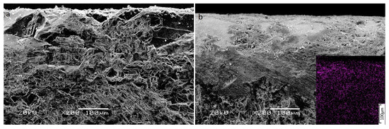 The sectional structures of the bone samples were also observed by SEM and the results are shown in Figure 8. Before the consolidation treatment, the bone sample was rough and loose in appearance (Figure 8a). After the consolidation treatment, the bone sample became even and compact (Figure 8b). This means that the pores and cracks in the bone substrate had been filled by the calcium sulfate consolidant, which was proven further by the elemental distribution results of EDX. Sulfur was found throughout the cross section of the bone sample in Figure 8b (inset), showing a sufficient permeability of the CSH suspension. Similarly, the suspension of nano calcium hydroxide in the alcohol solvent also presented very good properties and was used in the conservation of the bone relics [10]. The small size of the nano inorganic consolidants plays an important role in these cases.