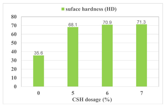 Scanning electron microscopy (SEM, FEI SIRION-100, 5.0 kV of accelerating voltage and 8.0 mm of working distance, Hillsboro, OR, USA) with energy-dispersive X-ray spectroscopy (EDX), Fourier transform infrared spectroscopy (FTIR, Nicolet 560, 4000–450 cm−1 range), and X-ray diffractometry (XRD, AXS D8 ADVANCE, Cu Ka radiation, scan range 2θ = 10–80°, Bruker, Billerica, MA, USA) were used to analyze the structure and composition of the samples. These analyses were performed on samples treated with 7% nano CSH.