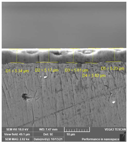 The microstructure of the base material and the deposited TiAlCN + TiAlN layer was examined using an electron microscope with an EDS analyzer was used for a more detailed study of the microstructure. In the first series, an analysis of the unused area A was carried out at a magnification of 2800× (Figure 2). In terms of magnification, the components are not visible, but it is clear that the layer is not flat, without cracks and damage. It can also be stated that the layer is uniform in terms of thickness. On the surface of the layer can be seen black holes that have formed as a result of sample preparation: cutting and grinding. Some defects were partially smoothed by the polishing process, but not all. No visible difference between the layers was observed. In the investigated area, the thickness of the applied layer was measured, which was continuous and compact and ranged from 5.17 to 5.82 µm. The 2/3 coating consists of a TiAlCN layer corresponding to 3.86 µm and a 1/3 TiAlN layer corresponding to 1.9 µm. In comparison with Chen’s study [55], where the value of one of the layers was 3.2 µm, in our case, much thinner layers were achieved, namely about 2.6 µm.
