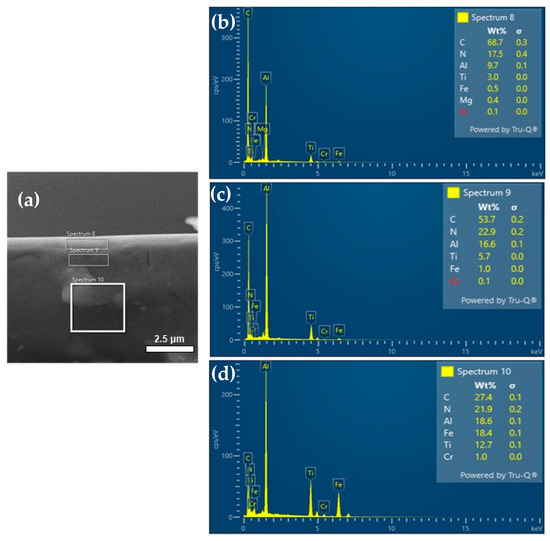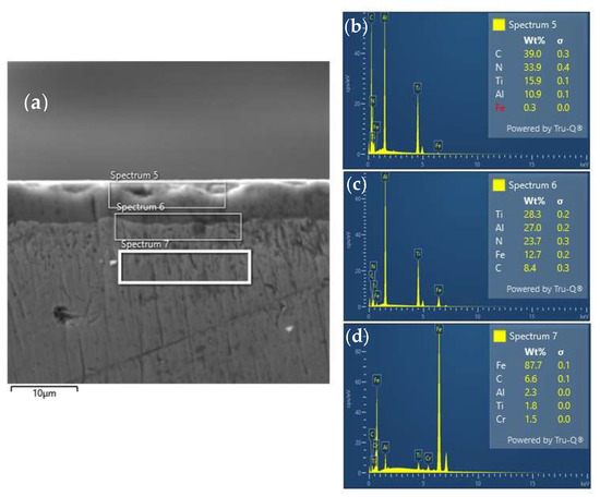 The results of the surface EDS analysis of the selected area (Figure 3b) showed a composite TiAlCN coating with the following percentage of elements: C-39.0%, N-33.9%, Ti-15.9%, Al-10.9%, and a small amount of the Fe-0.3%. The analysis showed that the composite TiAlCN coating 2/3 contains carbon and nitrogen, and 1/3 contains titanium and aluminum. Another investigated region (Figure 3c) showed the presence of an area partly consisting of the TiAlN layer and partly of the substrate with the composition: Ti-28.3%, Al-27.0%, N-23.7%, Fe-12.7%, and C-8.4%. The EDS analysis of the basic material (Figure 3d) was performed with the composition: Fe-87.7%, C-6.6%, Al-2.3%, Ti-1.8%, and Cr-1.5%. As can be seen in Figure 3, the TiAlCN and TiAlN layers were well connected to the base material.