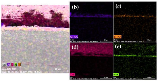 EDS analysis was also performed using a scanning electron microscope, which showed a very uniform distribution of individual elements in a provided layer. EDS elemental mapping was also performed, which showed the distribution of the elements used for coating (titanium, aluminum, and nitrogen), as well as carbon as an alloying element. From the EDS spectra provided in Figure 4, it can be concluded that the distribution of all elements is very equally in the studied area.