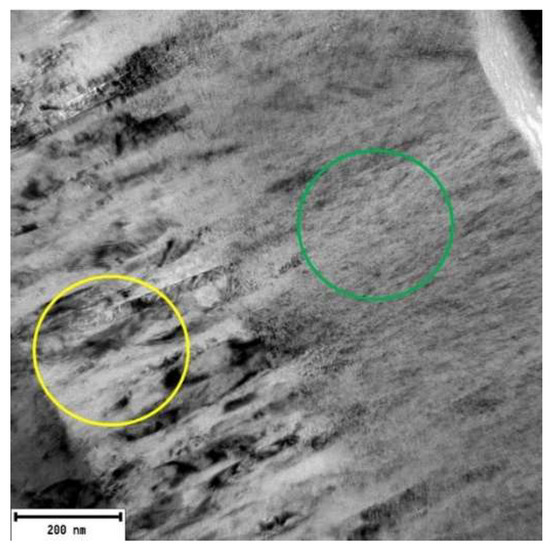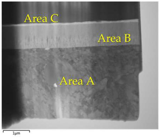 The FIB-prepared lamella was observed using eftem JEOL 2200 FS (Figure 5). As shown in Figure 6, the lamella was composed of a steel alloy (area A), a coating layer, and platinum covering material. The surface layer is formed by two distinctly separated areas (Figure 6, areas B and C). The area B (sublayer) adjacent to the substrate is formed by grains elongated across the layer. In the second sublayer (area C), the grains were more tender.