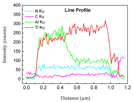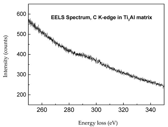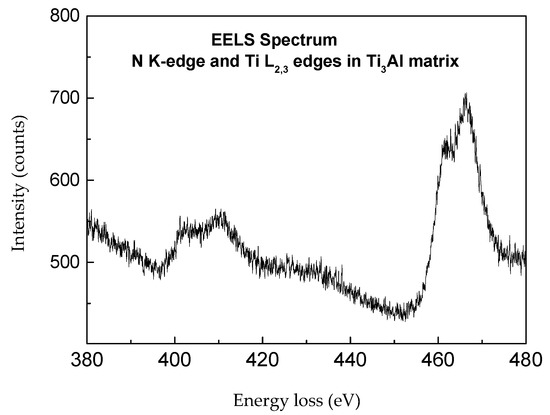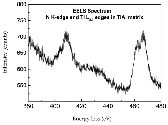 The layer was further examined using electron energy loss spectroscopy (EELS). The Ti-L2,3, N-K, and C-K spectra for TiAlN and TiAlCN coatings exhibited peak shapes and positions similar to those of TiC and TiN [58,59]. The presence of C was detected in a very small amount in the sublayer adjacent to the alloy, see Figure 12.