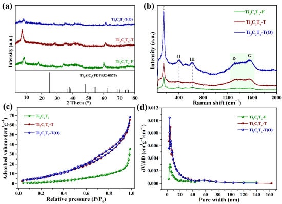 (a) XRD patterns; (b) Raman spectra; (c) N2 adsorption/desorption isotherms; (d) the pore-size distribution of Ti3C2Tx-F, Ti3C2Tx-T and Ti3C2Tx-T(O).