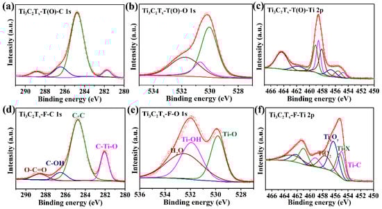 To explore the elemental chemical environment on the material surface, XPS analysis was performed on Ti3C2Tx-F and Ti3C2Tx-T(O) materials. As shown in Figure 4a,d, the characteristic peaks located at 281.8, 284.8, 286.3, and 288.5 eV in the C 1s XPS spectrum correspond to C–Ti–O, C–C, C–OH and O–C=O bonds []. In the O 1s XPS spectra, 529.8, 531.6 and 533.0 eV correspond to Ti–O, Ti–OH and H2O [], respectively (shown in Figure 4b,e). As shown in Figure 4c,f, four pairs of double peaks (Ti 2p3/2 and Ti 2p1/2) could be obtained by fitting the Ti 2p XPS spectra, and each pair of peaks conforms to a fixed area ratio (2:1) and a fixed peak spacing (5.7 eV). The peaks at binding energies of 454.8 and 455.8 eV in Ti 2p3/2 correspond to Ti–C and Ti–F bonds, and the peaks at binding energies of 457.0 and 458.6 eV correspond to Ti–O bonds (Ti3+:TixOy, Ti4+:TiO2). Compared with Ti 2p in Ti3C2Tx-F, Ti 2p in Ti3C2Tx-T(O) had reduced the characteristic peak intensity of Ti–C at 454.8 eV and Ti–F at 455.8 eV, and enhanced the Ti–O characteristic peak intensity at 458.6 eV []. The quantitative analysis of the sample surface by XPS indicated that the proportion of oxygen atoms of Ti3C2Tx-F was 18.04 at.%; the proportion of fluorine atoms was 12.74 at.%. In addition, the proportion of oxygen atoms of Ti3C2Tx-T(O) was 44.15 at.%, and the proportion of fluorine atoms was 1.72 at.%. The above phenomenon showed that the relative content of Ti–O on the surface of the material increased and the relative content of Ti–F decreased after low-temperature annealing treatment. Oxygen substitution occurred after the Ti–F bond was oxidized, and the content of oxygen-containing functional groups on the surface of the material increased.
