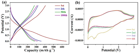 Figure 5a showed the constant current charge–discharge curve of Ti3C2Tx-T(O) negative electrode in the voltage range of 0.01 V–3.0 V. Under the current density of 0.1 A g−1, the discharge-specific capacity of the first cycle was 650.41 mAh g−1, the charge-specific capacity of the first cycle was 406.87 mAh g−1, and the corresponding initial coulomb efficiency (ICE) was 62.56%. The voltage plateau at 0.8 V in the first cycle of the discharge curve corresponds to the formation of the SEI (solid electrolyte interface) film in the first cycle. The charge–discharge curves of the 2nd, 50th, and 100th cycles basically coincide, which proved that the material had good cycle stability.